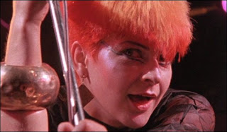 The figure moves forwards like a Samurai warrior poised for an attack but you can see a smile on her face which you can not resist. She's Toyah Willcox, England's Jeanne d'Arc of latter times.